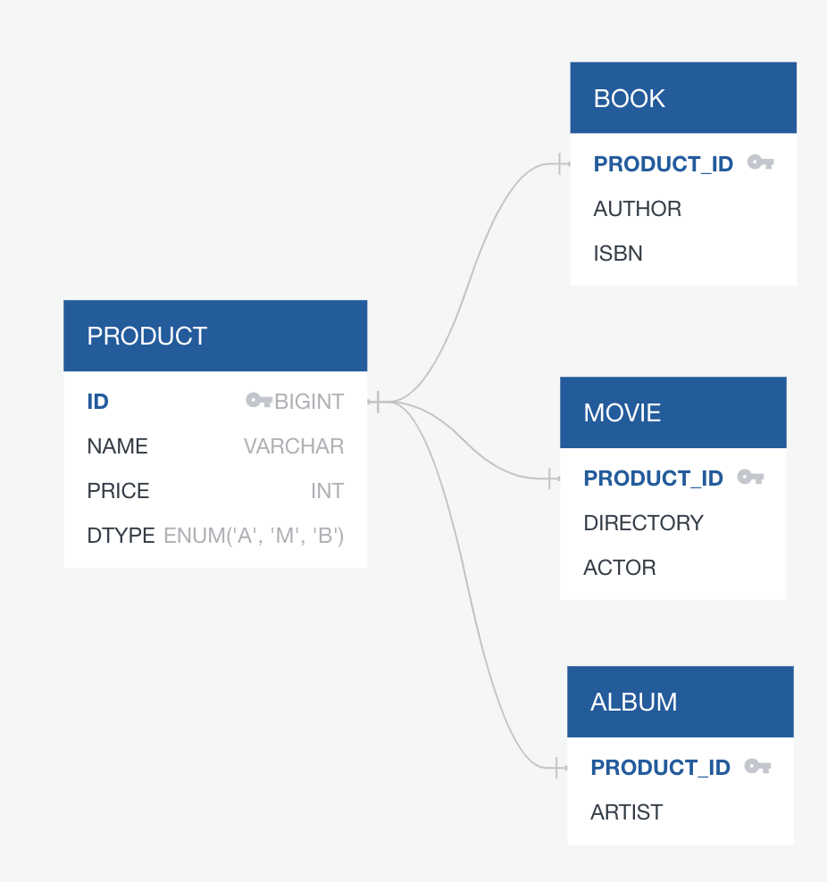 각각의 논리 모델을 모두 테이블로 만들고 부모테이블의 PK를 받아서 기본키와 외래키를 통해 사용하는 전략이다. 해당 방법을 사용할 때 주의할 점은 객체에서는 타입으로 구분할 수 있지만 데이터베이스에는 그런 개념이 없기 때문에 타입을 구분하는 전략을 사용해 주어야한다.