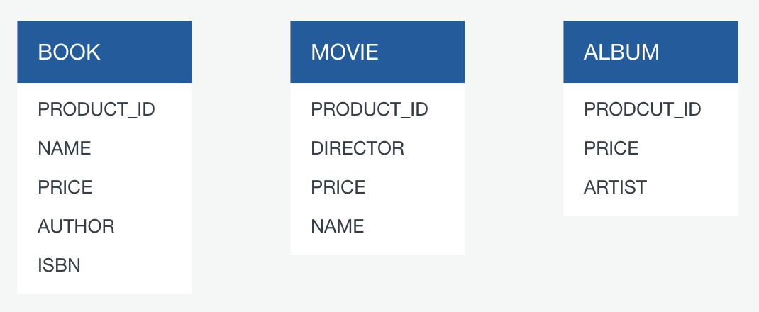- 조회라는 행동은 같지만 책, 영화, 앨범이 제공하는 정보는 서로 너무 다릅니다. 이것을 하나의 테이블에 처리를 해야된다면 그만큼 하나의 테이블에 서로 다른 내용의 컬럼을 가지고 있어야하고 null 필드가 많아짐에 따라 관리하기가 힘들어집니다.