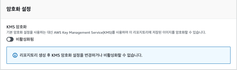 ECR에서 이미지를 올리게 되면 S3로 저장할 때 기본적인 AES-256 암호화 알고리즘을 사용하여 유휴 데이터를 암호화를 하여 저장하게 됩니다. 하지만 KMS 암호화를 키게 되면 AWS Key Management Service에 저장된 KMS 키로 서버 측 암호화를 사용할 수 있습니다.