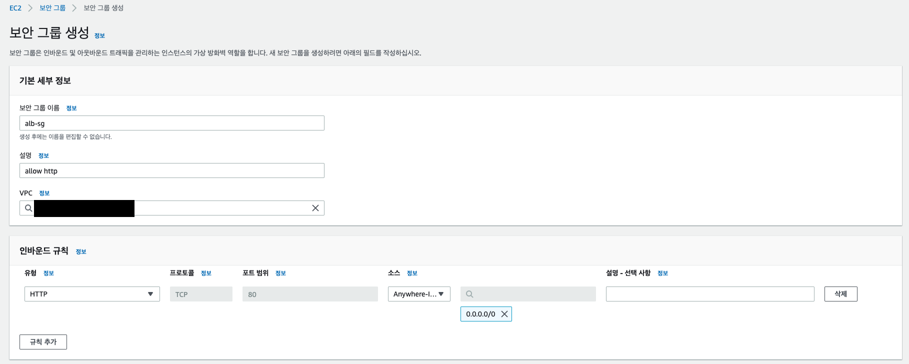 VPC를 선택하고 인바운드 규칙은 외부와 HTTP 통신할 수 있도록 모든 IP를 허용하는 보안그룹을 생성합니다.