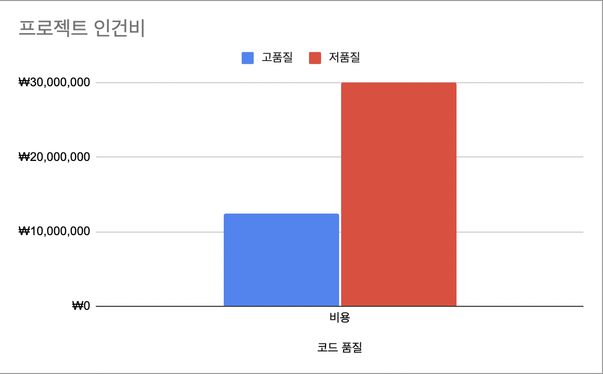 여기서 새로운 요구사항이 주어지고 이를 30일 동안 개발해야 한다고 가정해보자. 만약 저품질의 코드로 개발을 진행하면, 고품질 코드에 비해 개발 속도가 2배 느리다. 이는 인건비로 따지면 추가적인 1억 2천만원의 비용을 뜻한다. 또한, 고품질 코드의 프로젝트에서 버그 수정에 걸리는 시간을 하루라고 가정했을 때, 저품질 코드는 버그 발생률이 15배 많으므로 추가로 15일이 소요된다. 이는 약 6000만원의 추가 비용을 의미한다.
