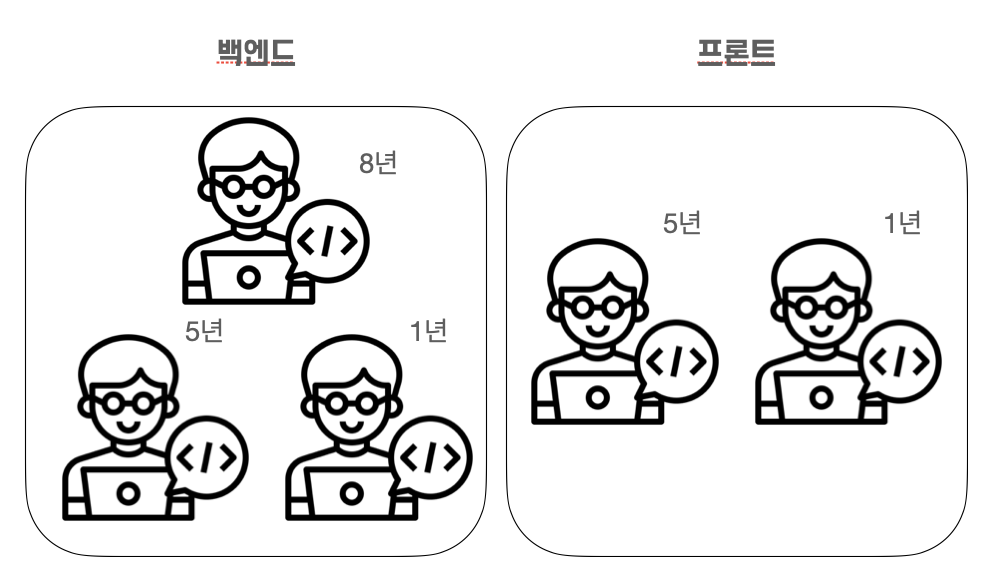 평균적으로 고품질의 코드는 저품질의 코드보다 버그가 15배 적고 개발 속도가 2배 이상 빠르고 일정준수의 불확실성이 9배 낮다고 한다.(물론 이런 평균은 환경, 규모, 사람에 따라 다름) 이제 최소 개발팀 인원을 5명 정도로 잡는다고 가정하고 리드 개발자과 백엔드 팀 3명, 프론트 2명이 존재하고 비중은 시니어(8년) 1명 미드(5년) 2명 주니어(1년) 2명으로 편성되어 있다.