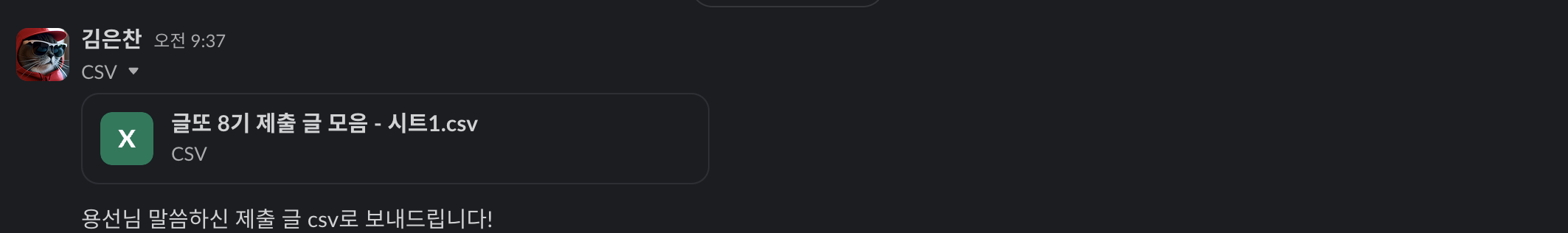 첫번째 스탭은 테스트로 활용할 수 있는 데이터가 필요했기에 글또를 운영하고 계신 성윤님께 구글 시트애 저장되어 있는 데이터를 요청드렸고 이부분은 은찬님과 상의해본 후 전달받기로 했다.