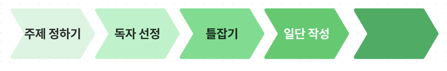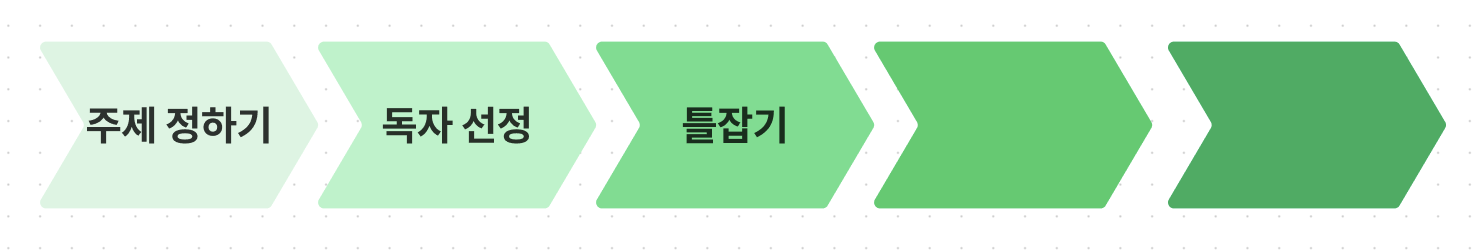 주제와 독자를 선정했으니 이제 글의 틀을 잡아야 한다. 글의 틀을 잡는 방법은 사람마다 다르다. 어떤이는 모든 목차를 적고 그안에 소제목을 자세하게 써놓은 사람도 있을 것이고 누군가는 브레인 스토밍 처럼 글의 주제들을 나열해놓고 차근차근 순서를 정리하는 식으로 틀을 잡는 사람도 있을 것이다. 나에게는 그렇게 디테일하게 틀을 잡고 상세하게 정리하는 방법의 글쓰기는 나에게는 글쓰는 것 만큼의 시간과 힘이 필요했고 글도 쓰기를 시작하기도 전에 지쳐 쉽게 쓰러지고는 했다. 그래서 나만의 간단한 루틴을 만들기 시작했고 그것은 아래와 같다.