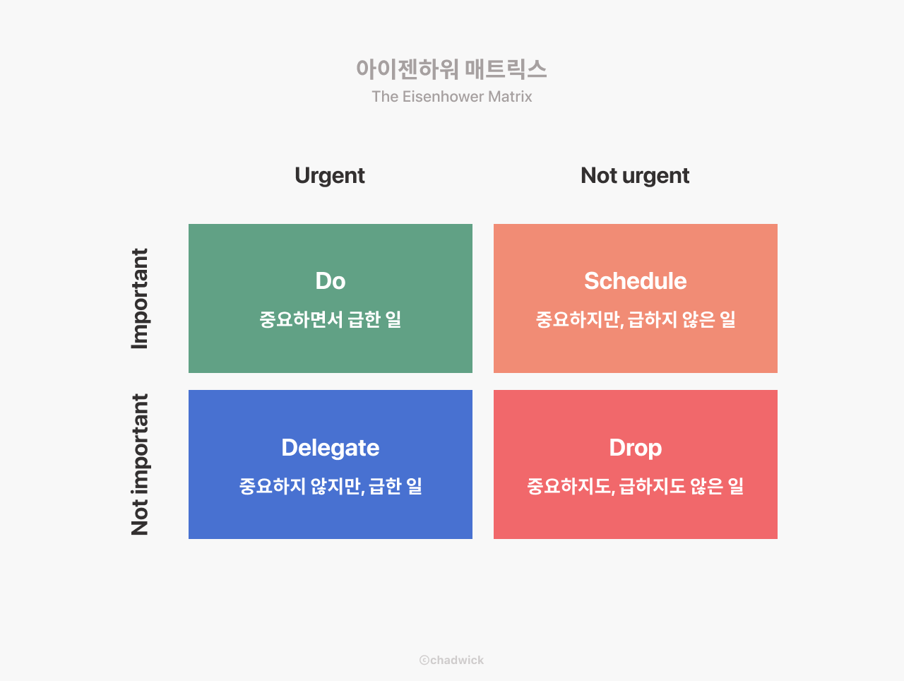 일단 채용 과정을 시작하기 위해서는 서류부터 통과했어야 했기 때문에 이력서를 1순위, 그다음은 코딩 테스트를 보고 통과해야지만 기술 면접을 볼 수 있기 때문에 2순위로 지정을 하였다. 3순위와 4순위는 아이젠 하워 매트릭스를 기반으로 지정하였다. 기술 면접은 코딩 테스트가 없이 진행될 수도 있기 때문에 중요하지만 급하지 않은 일에 해당하였고 포트폴리오와 사이드 프로젝트는 경력 개발자 기준으로는 다른 것에 비하면 중요도가 낮고 급하지도 않기 때문에 4순위로 배정하였다.