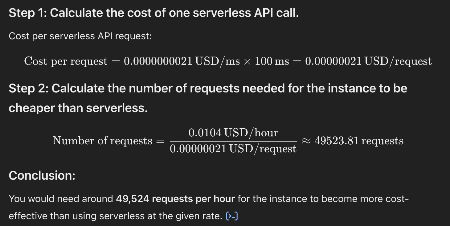 서버의 최소 스펙의 인스턴스인 T3.micro를 기준으로 평균 100ms 요청을 처리한다고 가정해봤을 때 계산을 해본 결과, 평균적으로 시간마다 5만 개의 요청이 와야 EC2를 운영하는 것이 비용적인 측면에서 유리하다고 이야기하고 있습니다. 위의 예시처럼 Serverless 플랫폼인 Lambda는 개발자가 부족한 회사뿐만 아니라 초기에 적은 트래픽을 가진 회사에서도 비용을 최적화하는데 좋은 솔루션이라는 것을 알 수 있었습니다