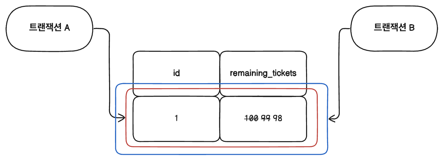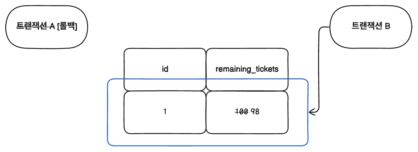 // B 트랜잭션의 티켓 개수 감소 100 -> 99
