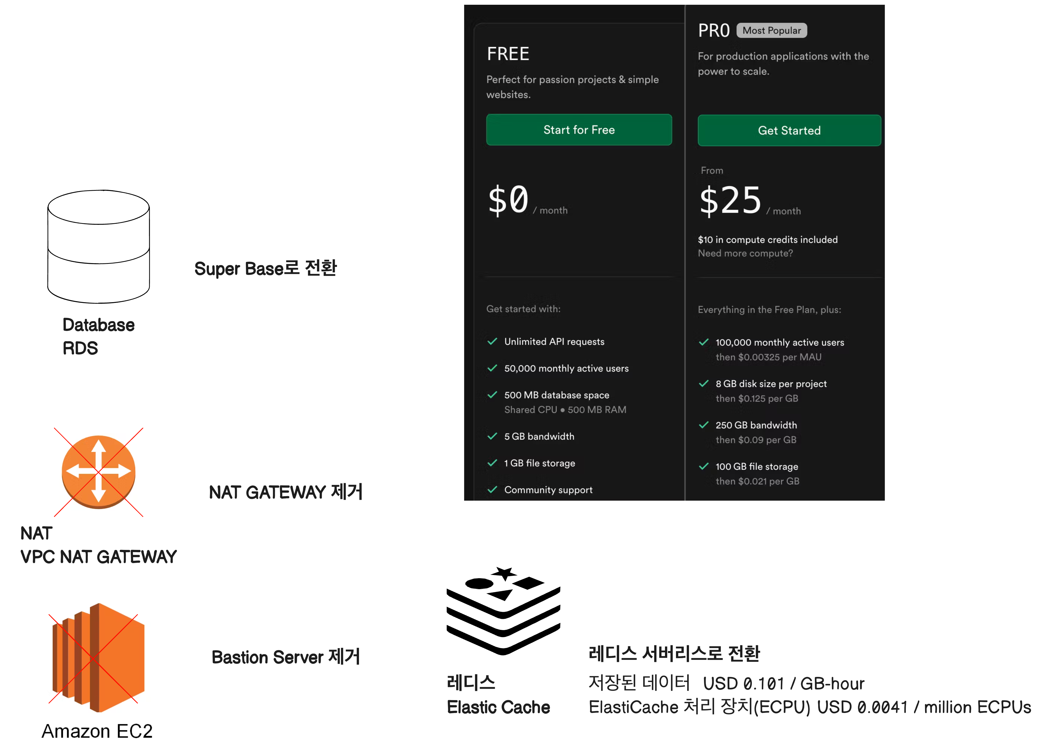 NAT(월 43$ ~ $45) => NAT 제거 0$NAT 인스턴스로 대체(EC2 T3.nano, Elastic IP 약 7$)RDS(T4.small 50GB 사용시 월 $43 ~ $48) => Supabase Free 0$ (Pro 사용시 25$)- ElasticCache(t4g.small 사용시 월 $35.28) => ElasticCache Serverless Valkey 7$
