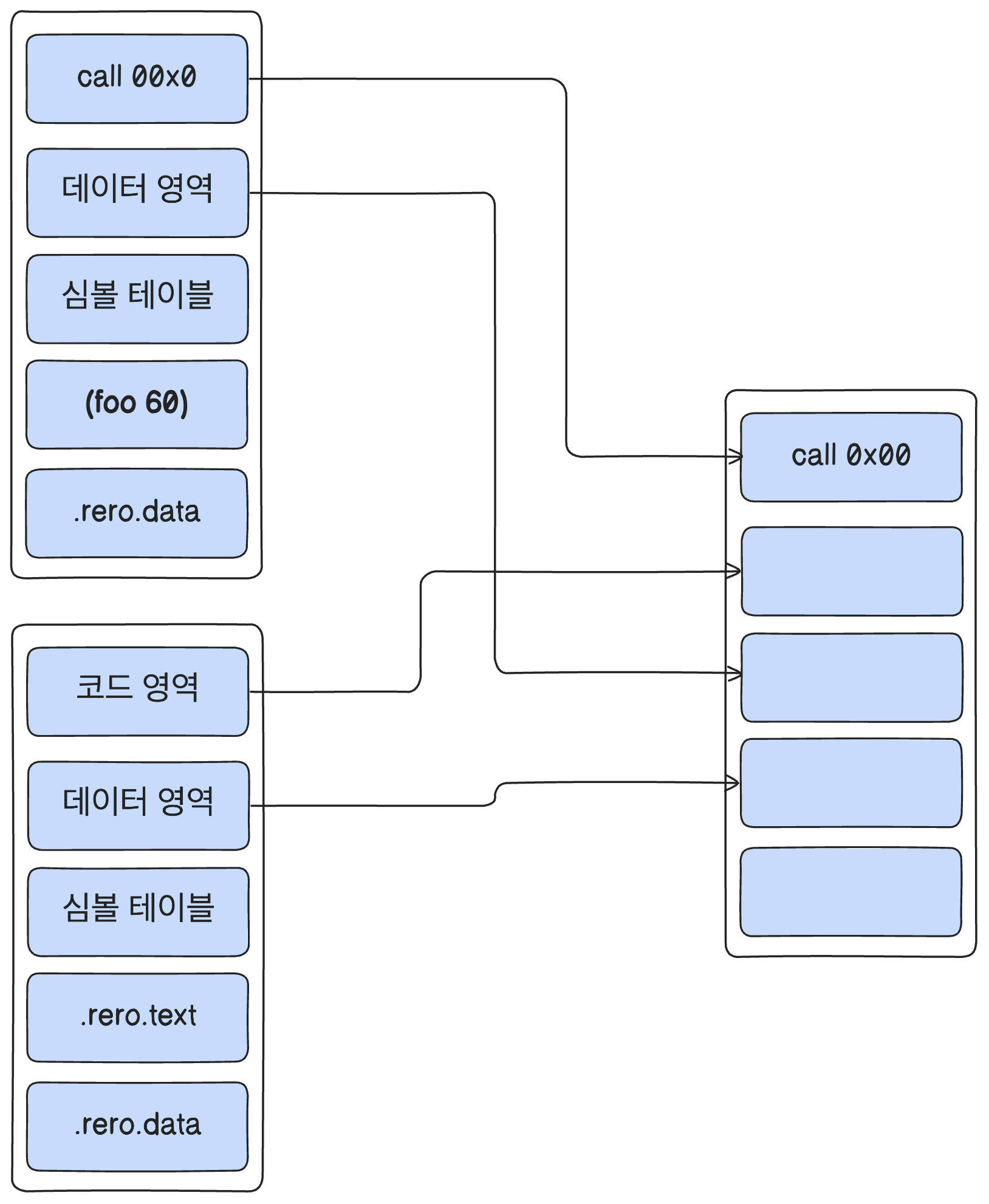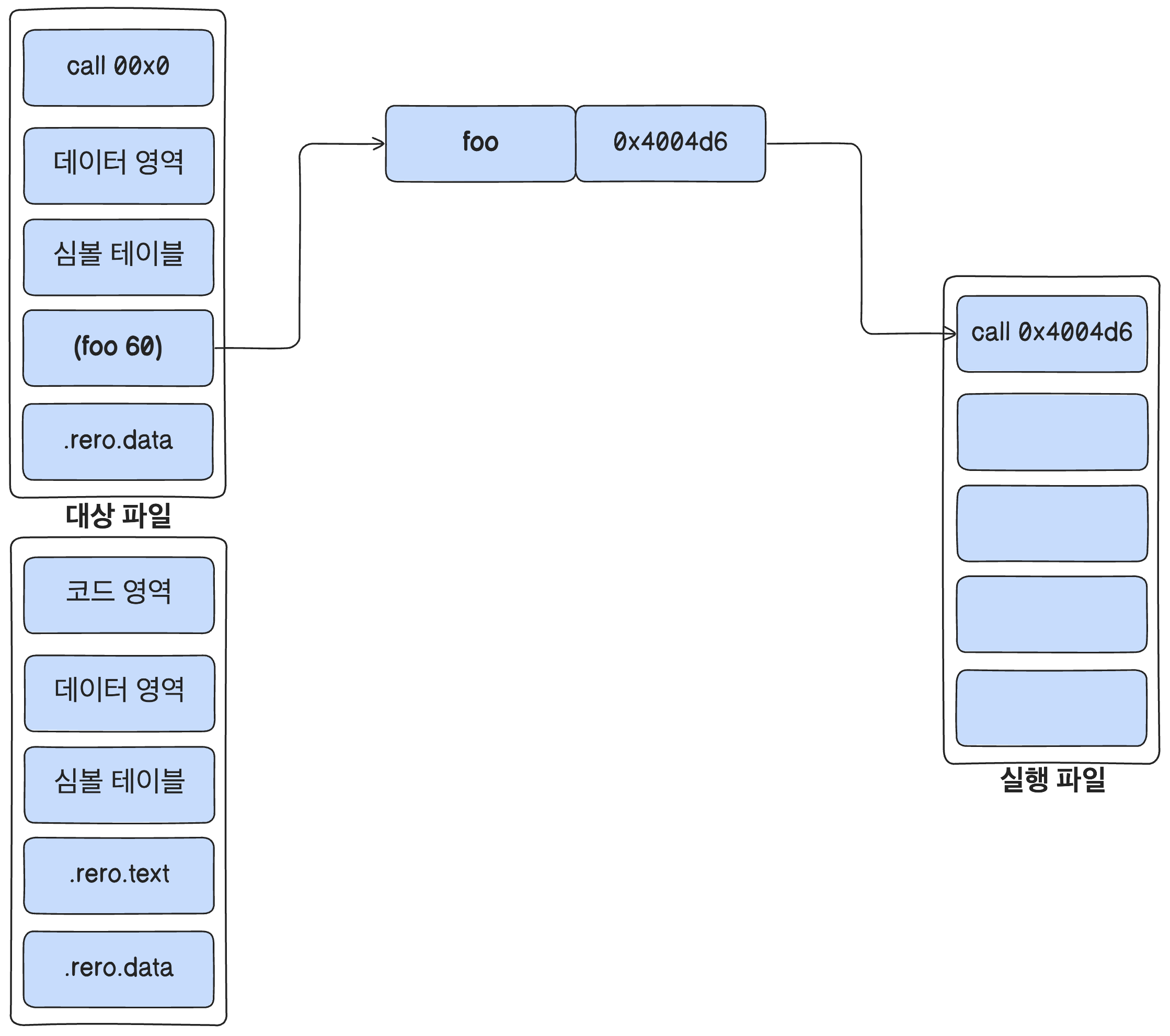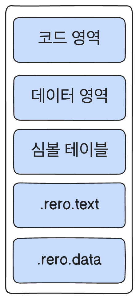 각 소스코드에는 대칭하는 대상파일이 있고 그 안에는 기계어가 있는 코드 영역, 전역 변수와 static 변수가 들어있는 데이터 영역, 전역 변수와 함수를 식별하는데 활용하는 심볼 테이블이 있습니다. 그외에 .rero.text 와 .rero.data가 있는데 메모리 주소를 확정할 수 없는 변수가 있을 때마다 .rero.text에 명령어를 저장하고 명령어와 관련된 데이터는 .rero.data에 저장합니다.