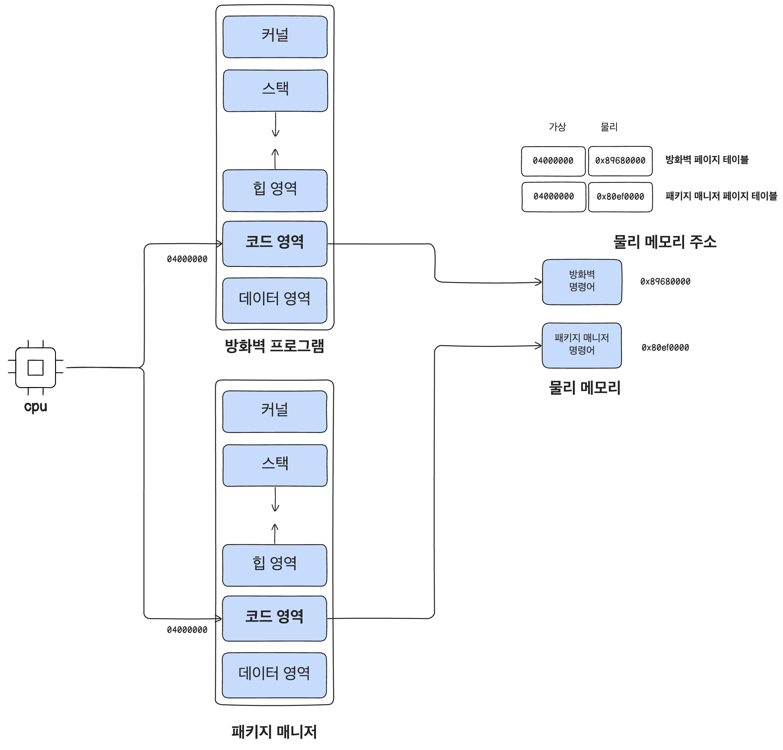 여기서 놀라운 점은 여러 개의 프로그램이 하나의 메모리 주소에서 시작될 수 있다는 점입니다. 리눅스 ELF 실행 파일 같은 경우 모두 0x400000에서 시작합니다. 그렇다면 동시에 방화벽 프로그램과 패키지 매니저 프로그램이 뜬다면 어떻게 메모리를 할당해서 가져올까요? 실제 동작을 시켜보면 방화벽 프로그램에서 가져온 0x400000은 방화벽에 속한 명령어를 가져오고 패키지 매니저에 가져온 0x400000은 패키지 매니저의 명령어를 가져옵니다.