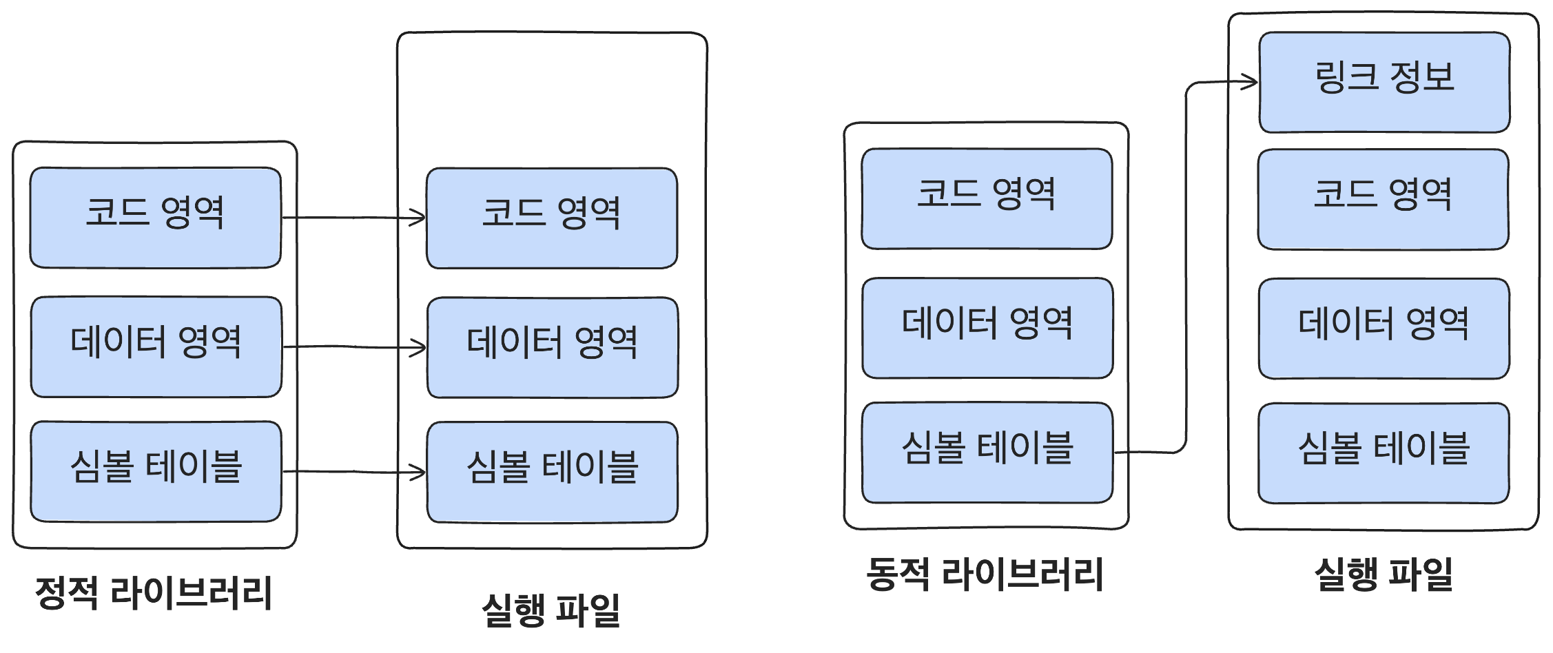 동적 라이브러리도 정적 라이브러리와 마찬가지로 코드 영역과 데이터 영역은 존재하지만 데이터 영역, 코드 영역, 심벌 테이블 정보를 모두 복사하는 정적 라이브러리와 달리 라이브러리 이름, 심벌 테이블, 재배치 정보 등과 같은 필수 정보만 복사합니다. 그렇기 때문에 실행 파일의 크기를 줄일 수 있습니다.