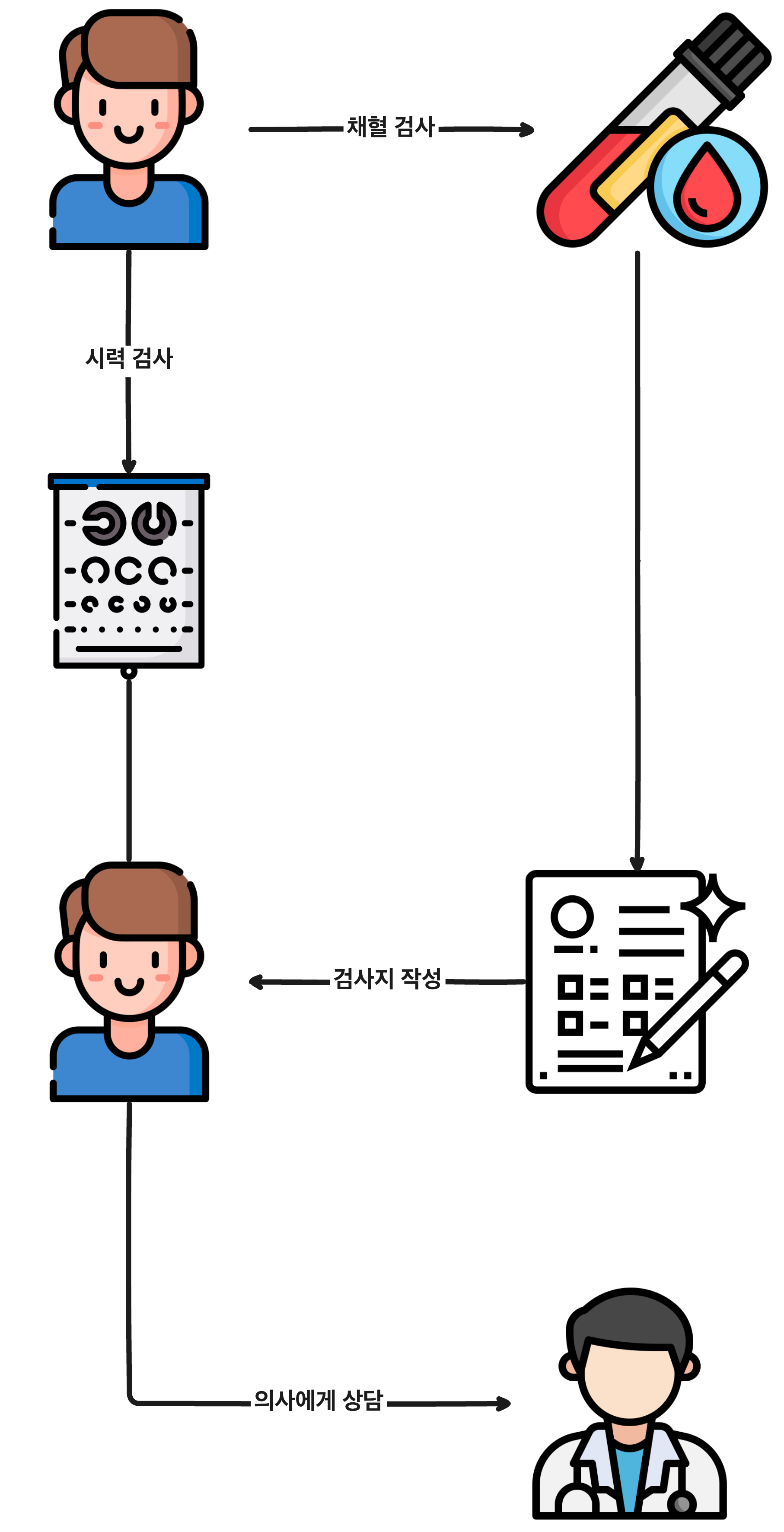 위의 그림은 비동기의 과정입니다. 여러분이 채혈 검사를 받고 검사지가 완성되는 것에 오래걸리기 때문에 따로 기다리지 않고 바로 시력검사를 받으러 갔습니다. 그 뒤에 검사지가 작성되어 전달 받았고 의사에게 상담을 받아 검진을 마쳤습니다. 이처럼 따로 요청한 작업을 기다리지 않고 바로 다음 단계를 진행하는 것을 비동기라고 합니다.