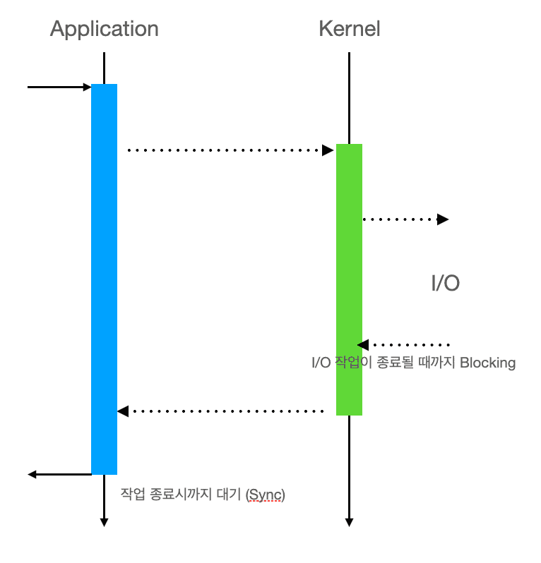 위의 그림처럼 writeFile이 파일 쓰기 호출을 하게 되면, 최하위 단계에서 운영체제에 시스템 호출(System call)을 보내게 됩니다. 이때 운영체제는 해당 스레드를 대기 상태(blocked)로 전환하고, 커널 모드에서 디스크 쓰기 작업을 수행합니다. 디스크 I/O가 완료되면 커널은 해당 스레드를 실행 대기열로 올려 다시 사용자 모드로 복귀시킵니다. 이처럼 제어 권한을 커널에게 넘기고 요청한 작업이 완료될 때까지 스레드가 대기하는 방식을 블로킹 입출력(blocking I/O)이라고 합니다.