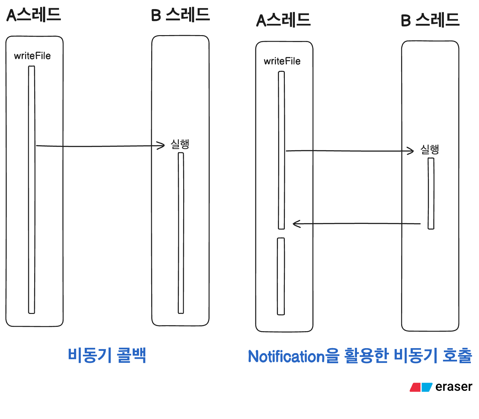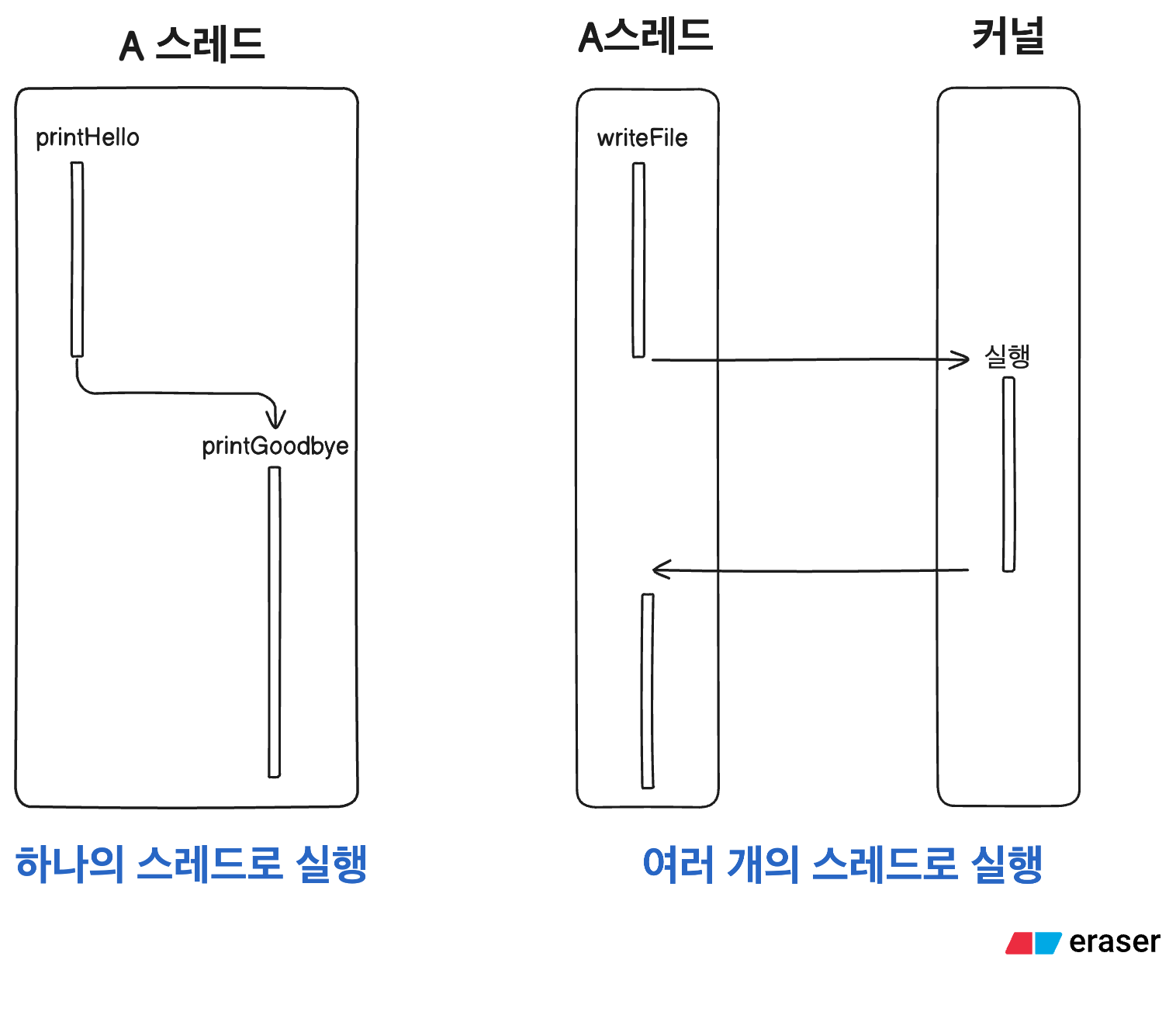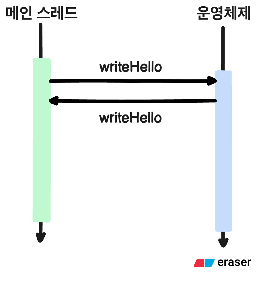 이제는 코드를 통해 알아봅시다. 위의 코드를 보면 printHello 함수가 완료될 때 까지 printGoodbye 함수는 호출되지 않습니다. printHello와 printGoodbye는 같은 스레드 안에서 실행되며 우리가 흔히 보는 실행의 흐름입니다. 하지만 두개의 스레드에서 동기적으로 동작하는 경우가 있는데 파일을 입출력할 때가 대표적인 예시입니다. 아래의 그림을 살펴봅시다.