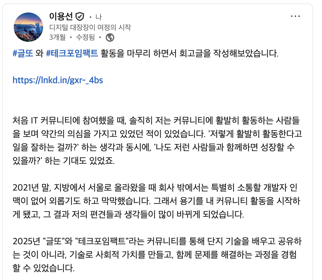 만약 제가 채용 담당자라면, 단순히 이력서만 제출한 사람보다는 블로그, 링크드인, 깃허브 등을 통해 꾸준히 활동하며 자신의 성장 과정을 투명하게 보여준 사람을 선택할 것입니다. 어떤 사람인지 예측할 수 있다는 것, 그것이 불확실한 시장에서 가장 큰 경쟁력이 되기 때문입니다.