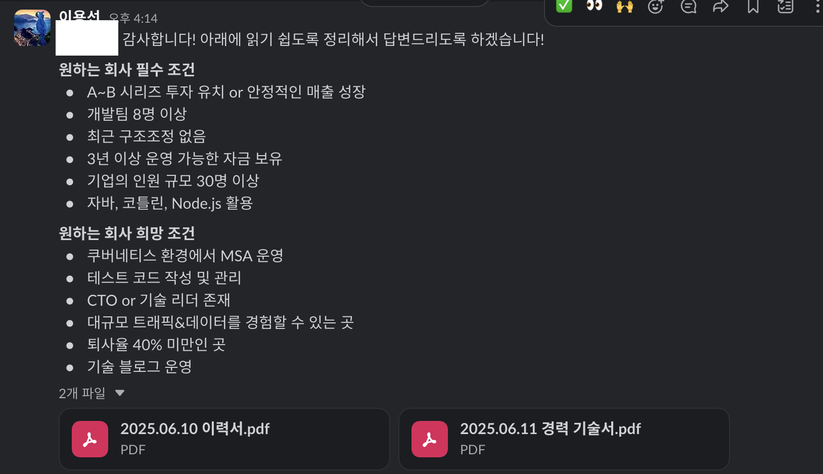 - 면접의 현실: 커뮤니티 활동, 사이드 프로젝트, 블로그 글 등이 서류 전형이나 자기소개에는 도움이 되지만, 면접에서는 결국 실무 경험이 중심이 되어 진행됩니다.