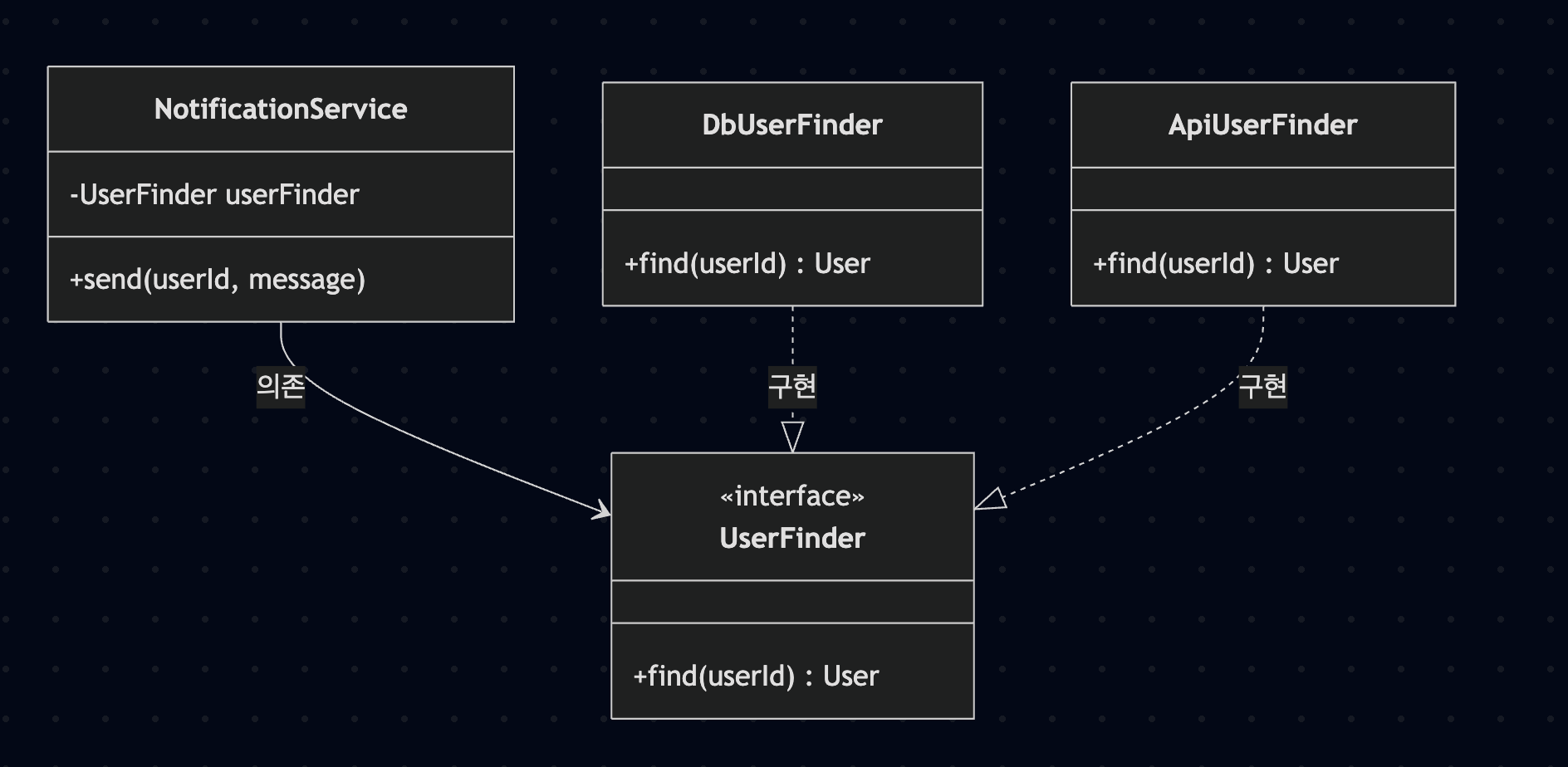 앞서 구현한 전략 패턴을 다시 살펴봅시다. DbUserFinder의 조회 로직을 수정하더라도 NotificationService는 전혀 영향을 받지 않습니다. 각자의 책임 범위 안에서만 변경이 일어나기 때문입니다.