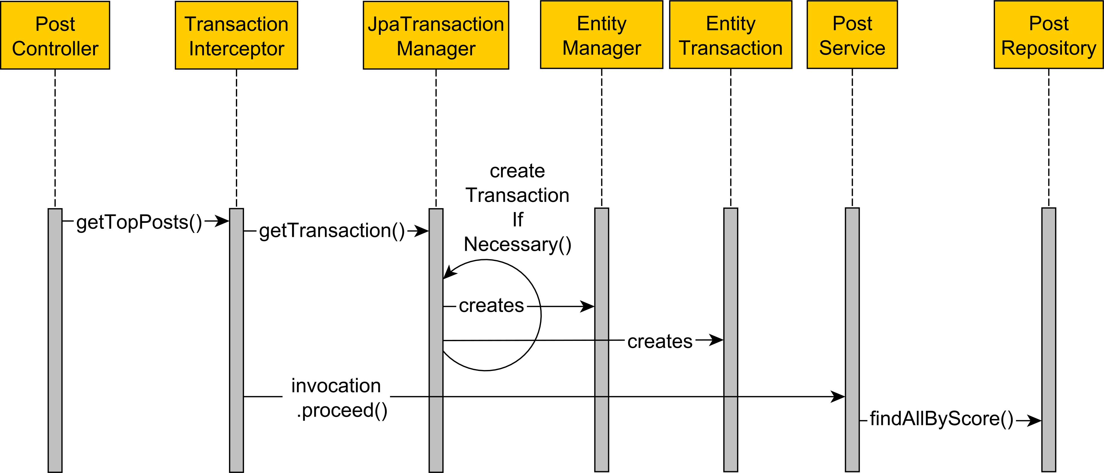 우리가 @Transactional을 붙이는 순간, 스프링 내부에서는 보이지 않는 두가지 역할을 합니다. 첫번째로는 트랜잭션 컨텍스트를 생성하는데 이 컨텍스트는 커넥션 획득 -> 트랜잭션 시작 -> 커밋 또는 롤백 -> 리소스 정리 등의 변하지 않는 행위를 하는 흐름이 저희의 코드를 감쌉니다.