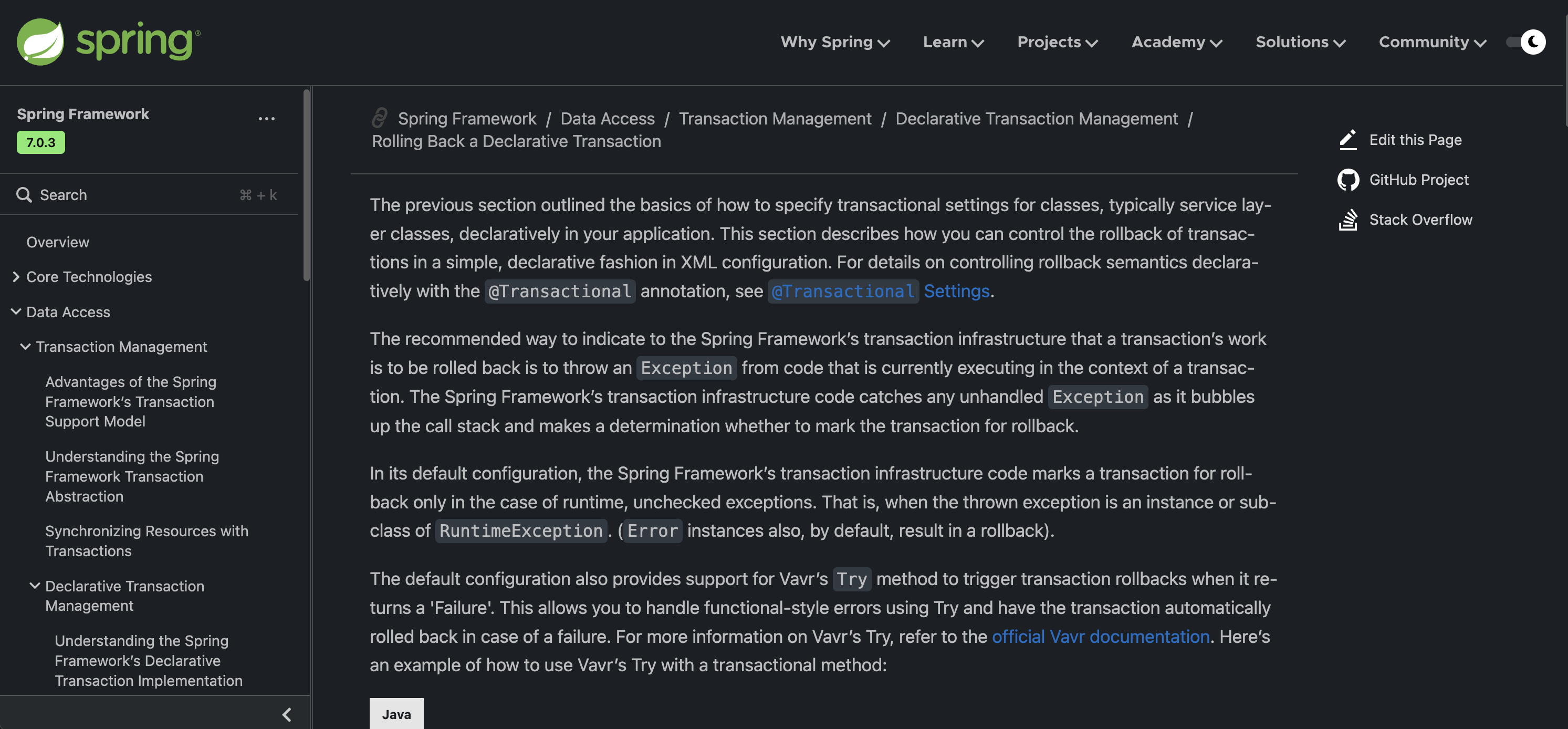 왜 이전에 스프링은 Runtime Exception을 상속받은 Unchecked Exception을 트랜잭션을 롤백하도록 구현하였을까요? 그건 바로 이전에 이야기했듯이 Unchecked Exception은 시스템적으로 처리를 할 수 없는 경우에 사용하기 때문입니다. 아래의 공식 문서 내용을 살펴봅시다.