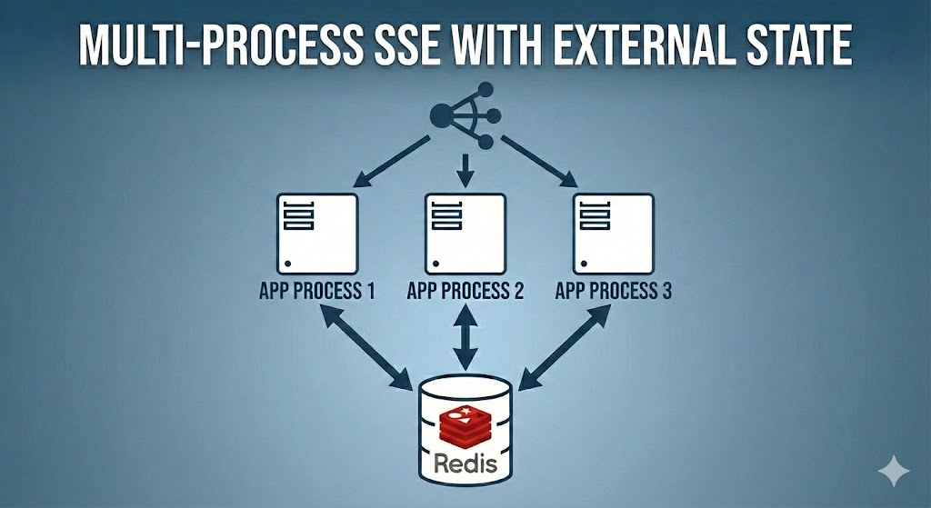 로드 밸런싱을 하는 멀티 프로세스 환경이라면 애플리케이션의 자료구조만으로는 부족합니다. 서로 다른 프로세스가 각자 데이터를 보유하고 있기 때문입니다. 요청이 어느 프로세스로 가느냐에 따라 구독 중인 SseEmitter 수가 달라질 수 있습니다. 이런 경우에는 Redis 같은 외부 인프라를 활용하는 것이 좋습니다.