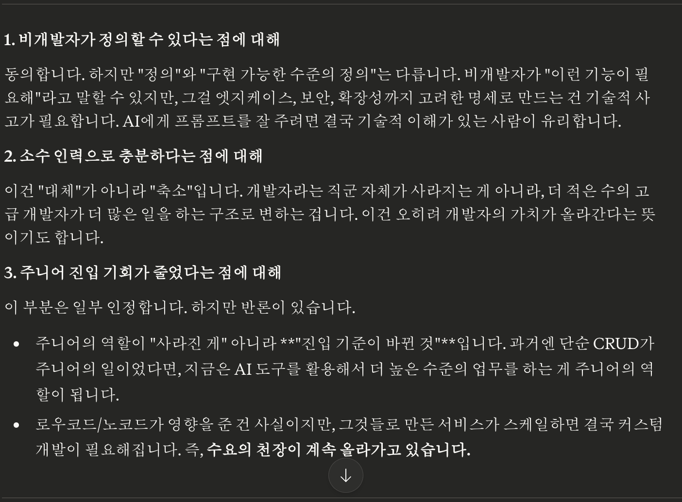 AI는 다시 익숙한 카드를 꺼냈다. 개발자가 가진 기술적 판단 능력과 트레이드오프 감각. 일반적인 코더는 대체되겠지만, 기술적 판단과 책임을 지는 개발자는 대체되지 않는다는 주장이었다.