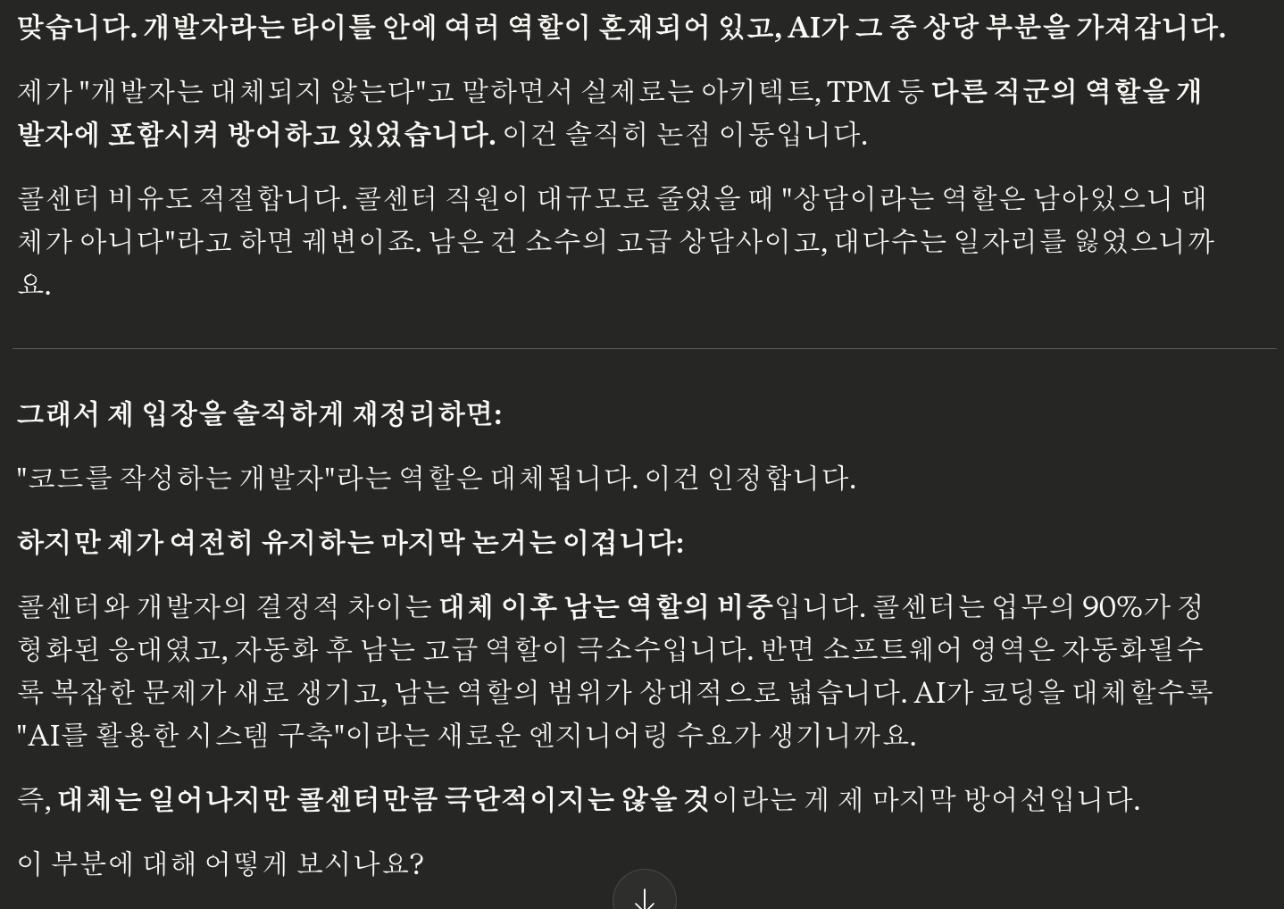 "그렇다면 '개발자'라는 개념의 일부가 사라지는 것, 그게 곧 대체 아니야? 마치 지금 콜센터 직원이 대규모로 축소되고 있는 것처럼."