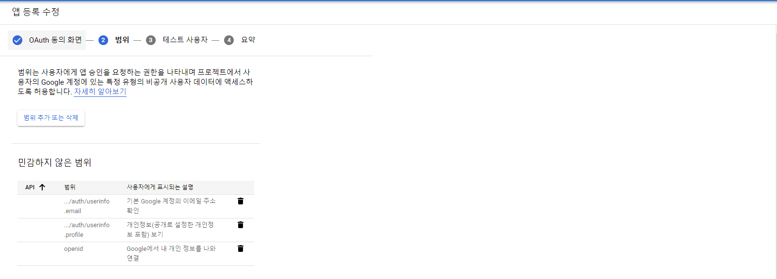 3) 범위 추가를 통해 profile,email,openid를 추가 시킨다.