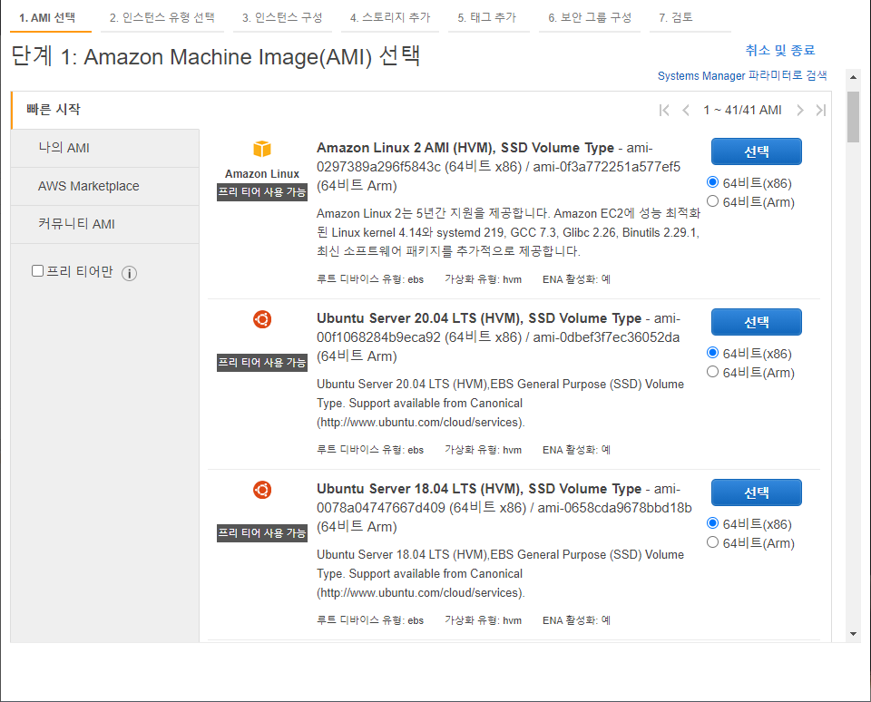 3.인스턴스 시작 클릭후 원하는 ami선택(필자는 ubuntu 18.04 선택)