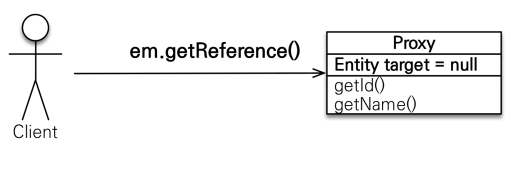 • em.getReference(): 데이터베이스 조회를 미루는 가짜(프록시) 엔티티 객체 조회