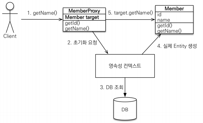 • 프록시 객체를 초기화 할 때, 프록시 객체가 실제 엔티티로 바뀌는 것은 아님, 초 기화되면 프록시 객체를 통해서