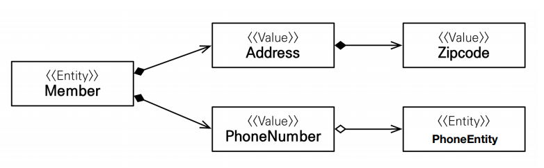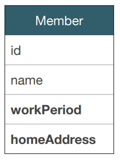 • 회원 엔티티는 이름, 근무 기간, 집 주소를 가진다.