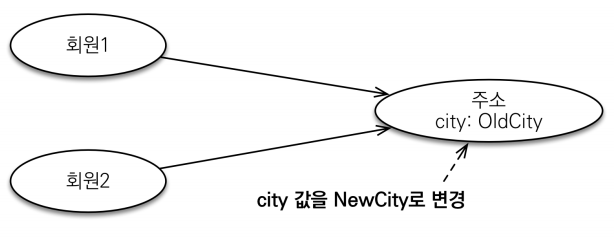 • 임베디드 타입 같은 값 타입을 여러 엔티티에서 공유하면 위험함