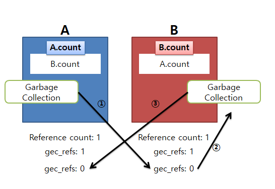 - 객체에 gc_refs 필드를 레퍼런스 카운트와 같게 설정한다.