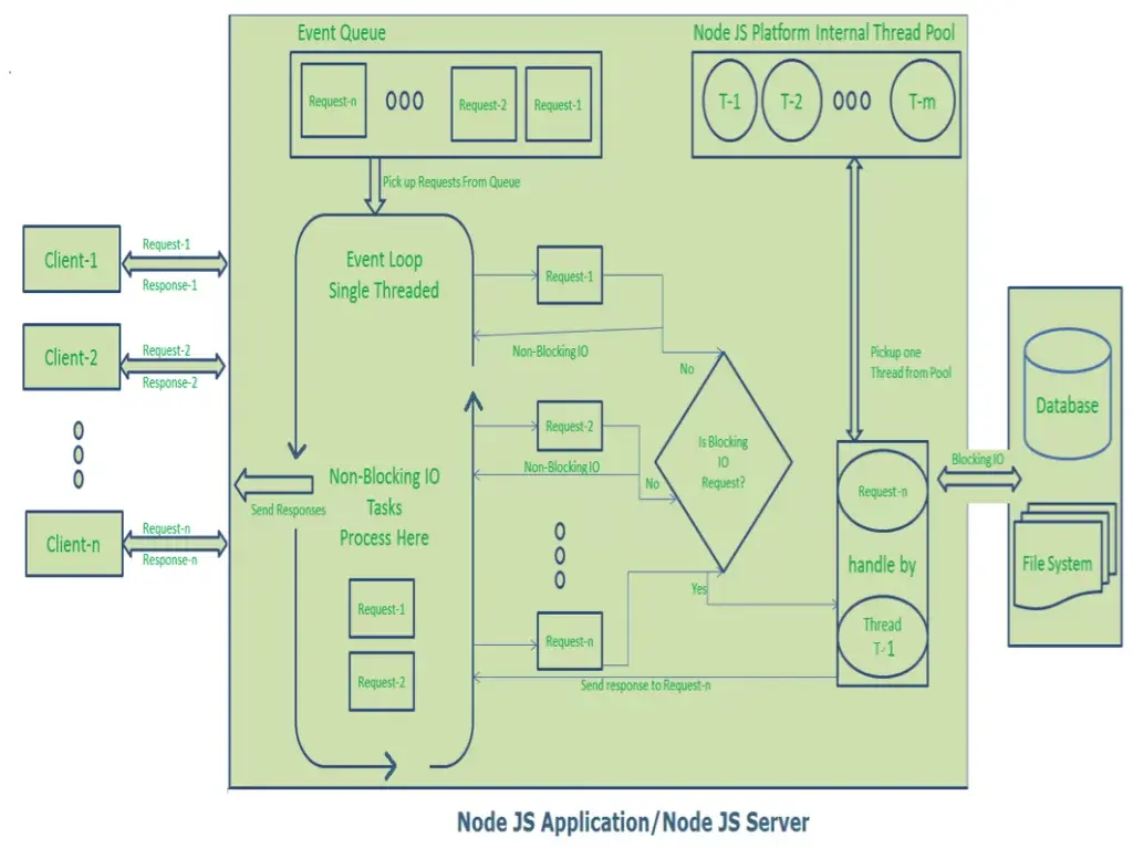 - Node JS 웹 서버는 내부적으로 제한된 스레드 풀을 유지 관리하여 클라이언트 요청에 서비스를 제공한다.