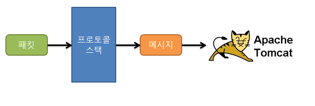 - 패킷이 물리적인 웹 서버에 도착하면 웹 서버의 프로토콜 스택은 패킷을 추출하여 메시지를 복원하고 WAS에 넘긴다.