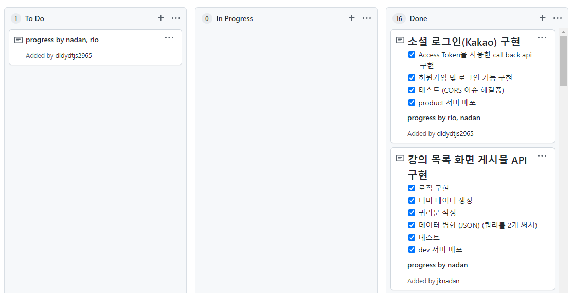 저희 과정은 라이징 테스트를 진행하기 전에 어느 정도 시간을 주셔서 프로젝트를 어떻게 관리(버전 관리)하고 업무 사이클 및 커뮤니케이션 진행하는 방법과 개발 문서화를 통해 어떻게 진행사항을 공유할지 간략하게 나마 프로세스를 잡을 수 있었습니다. 참고로 저는 애자일 방법론을 참조하여 진행을 했었습니다.