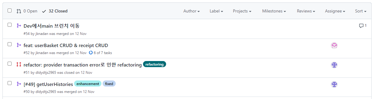 그리고 실제 팀프로젝트와 유사하게 진행을 하고 싶다는 욕심에 개인 프로젝트 때 사용하지 못했던 깃의 기능들을 활용했었는데 이때 실무에서 가장 가까운 지식들을 많이 배울 수 있었습니다. 여러분들도 하시는 것을 강추드립니다!