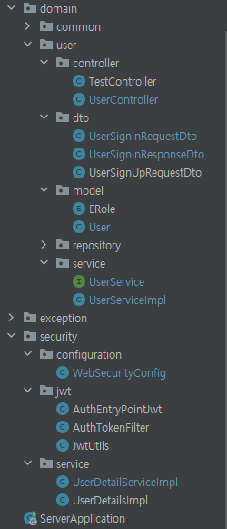 제가 사용한 프로젝트 구조입니다. 저는 따로 테이블을 나뉘어서 관리 하지 않기 때문에 Role 테이블을 만들지 않았습니다. 예제에서 커스텀해서 사용했기 때문에 참조하시는 분은 링크를 통해 따라하시는 것을 추천드립니다.